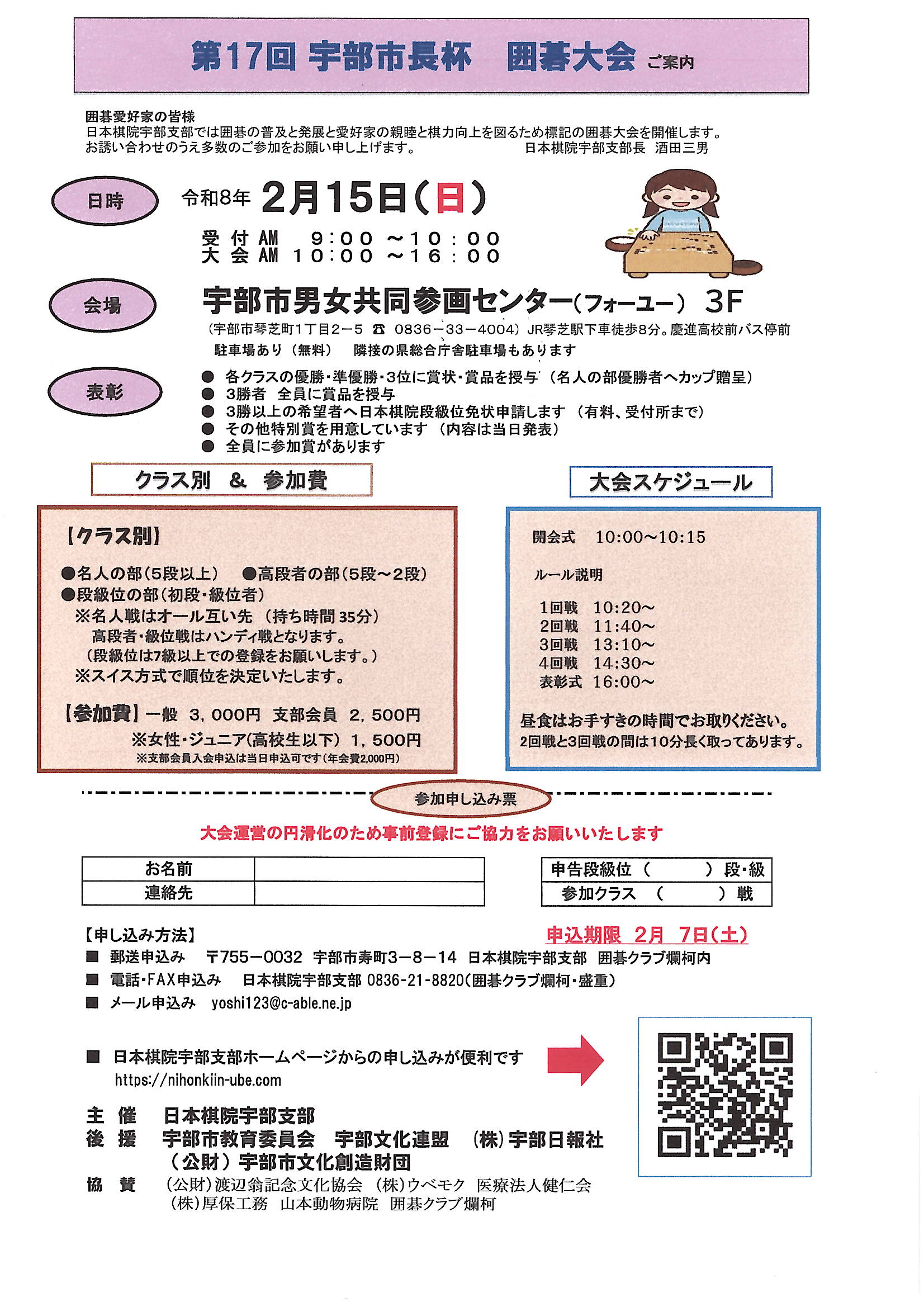 2026年1月3日 / 最終更新日時 : 2026年2月5日 ranka 囲碁大会案内 第17回宇部市長杯大会案内 囲碁愛好家の皆様 日本棋院宇部支部では囲碁の普及と発展と愛好家の親睦と棋力向上を図るため標記の囲碁大会を開催します。 お誘い合わせのうえ多数のご参加をお願い申し上げます。 日本棋院宇部支部長 酒田三 […]